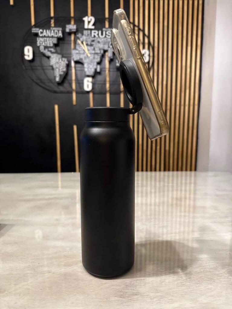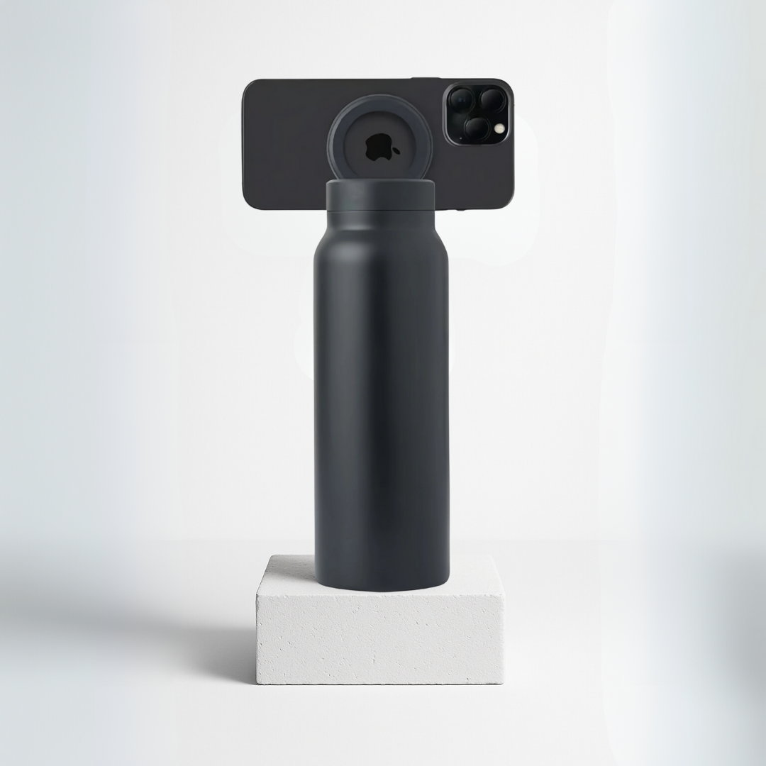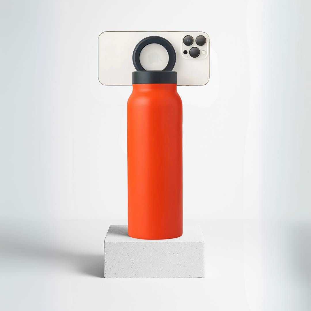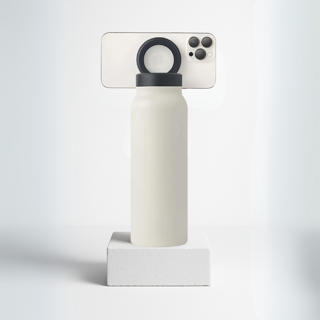 Opplev full fleksibilitet med vår stilrene vannflaske i rustfritt stål, som dobler som praktisk mobilholder. En innebygd magnet i lokket lar deg feste telefonen sikkert og henderfri, perfekt når du følger treningsvideoer eller holder videomøter.