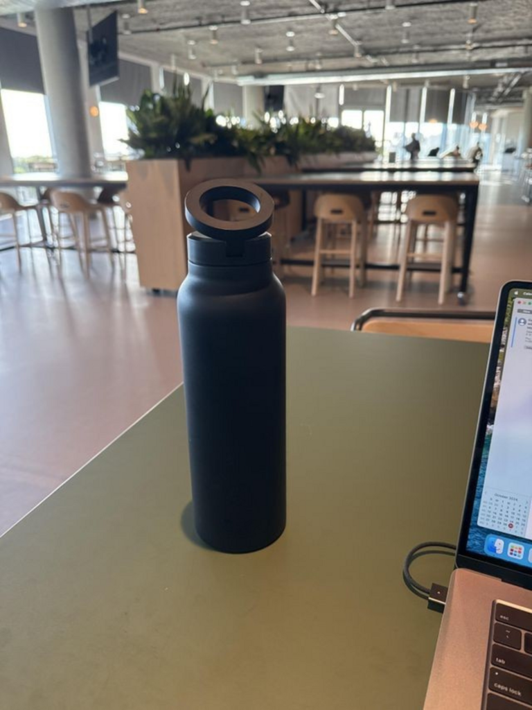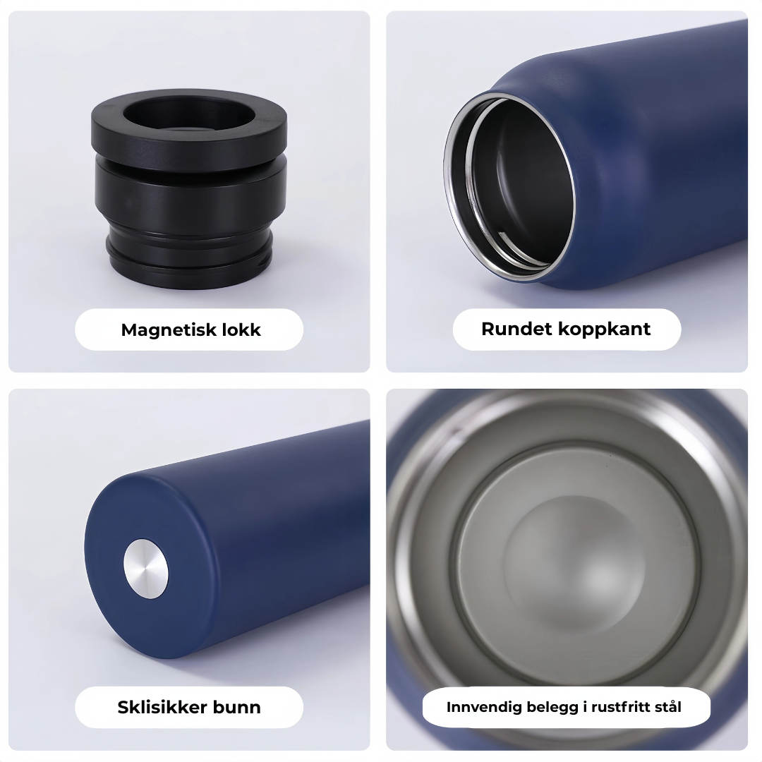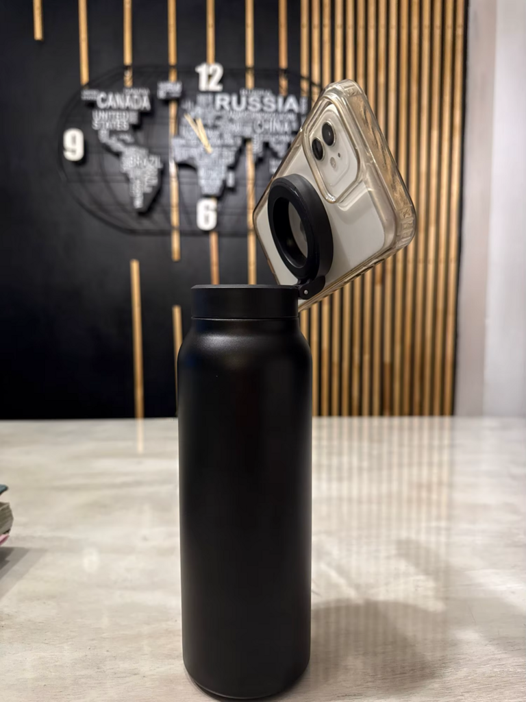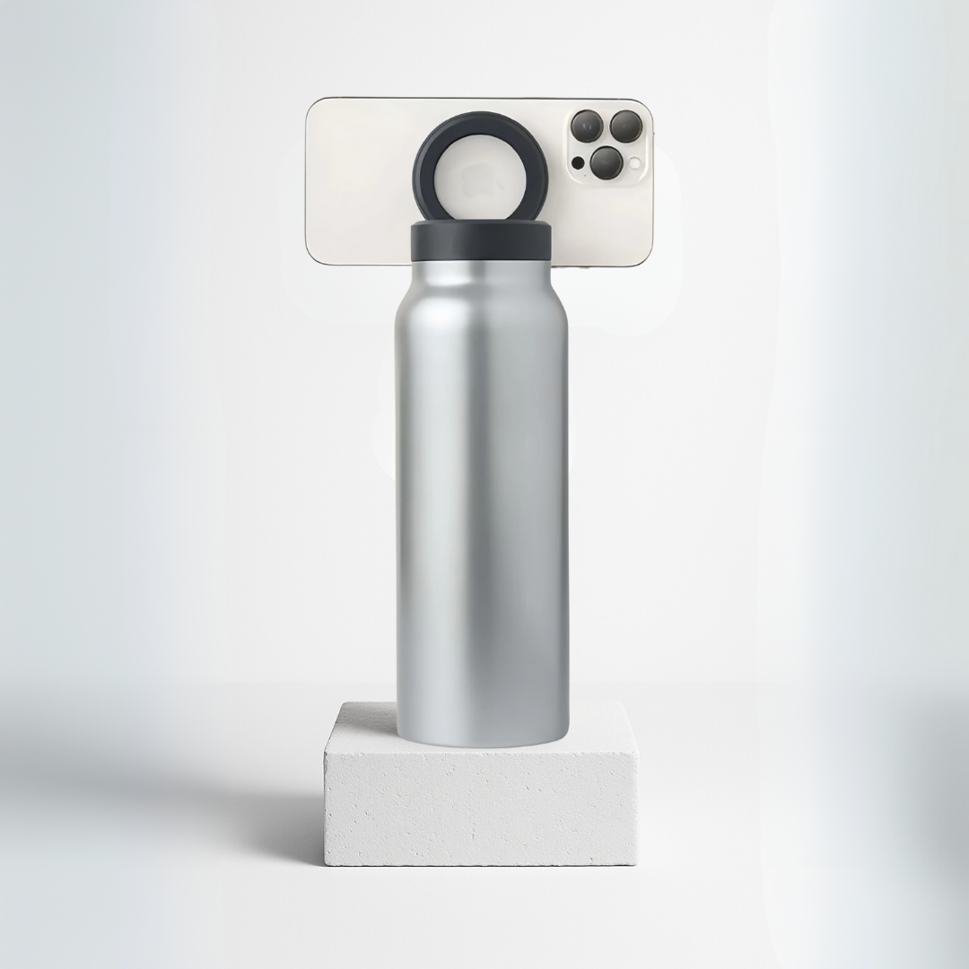 Opplev full fleksibilitet med vår stilrene vannflaske i rustfritt stål, som dobler som praktisk mobilholder. En innebygd magnet i lokket lar deg feste telefonen sikkert og henderfri, perfekt når du følger treningsvideoer eller holder videomøter.
